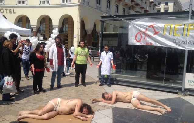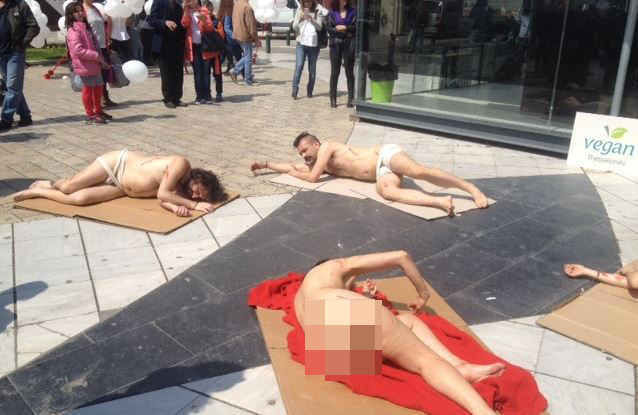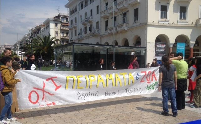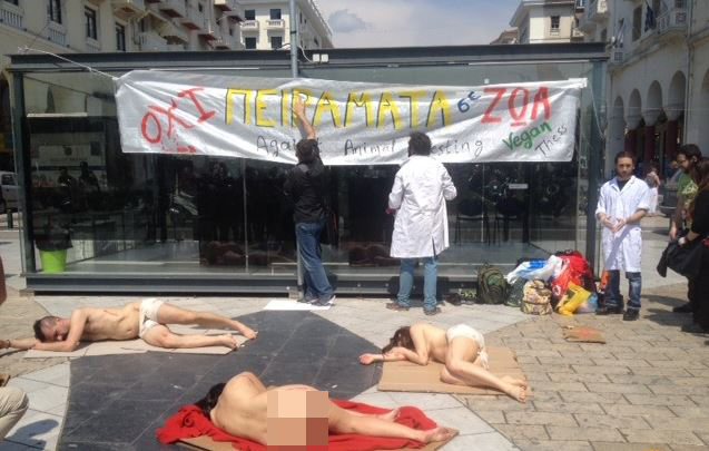 Με αφορμή την Παγκόσμια Ημέρα Κατάργησης των Πειραμάτων σε Ζώα, ακτιβιστές, μέλη της συλλογικότητας Vegan Thessaloniki, πραγματοποίησαν γυμνή διαμαρτυρία στην πλατεία Αριστοτέλους στη Θεσσαλονίκη, προκειμένου να ευαισθητοποιήσουν τον κόσμου, για την προστασία των ζώων.