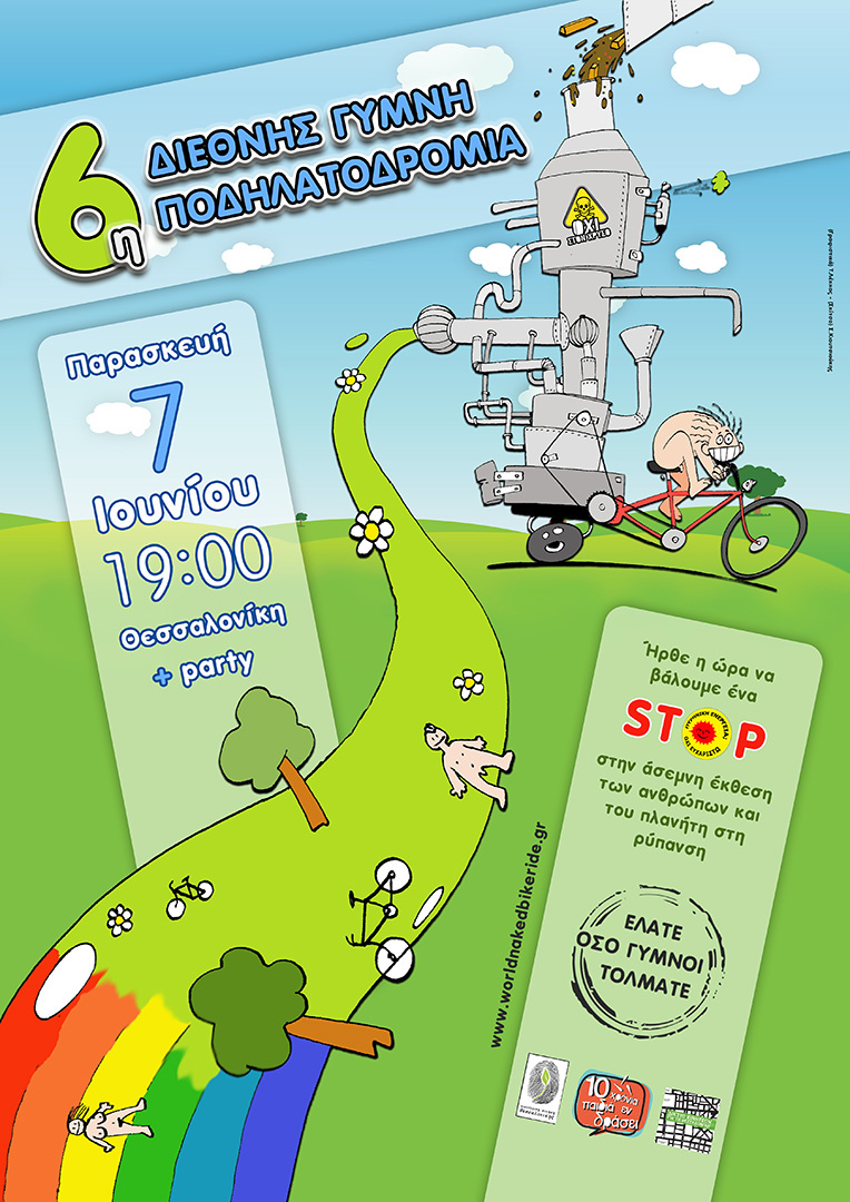 «Ήρθε η ώρα να βάλουμε ένα STOP στην ‘άσεμνη’ έκθεση των ανθρώπων και του πλανήτη στη ρύπανση», λένε οι ποδηλάτες και βγάζουν τα ρούχα τους στις  7 Ιουνίου στη Θεσσαλονίκη στο πλαίσιο της 6ης Διεθνούς Γυμνής Ποδηλατοδρομίας. Πρόκειται για ένα διεθνές κίνημα όπου και συμμετέχουν σε αυτό περισσότερες από 70 πόλεις σε όλο τον κόσμο.