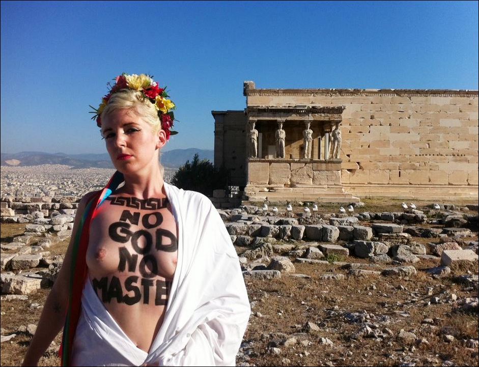 Οι Femen έφτασαν και στην Ακρόπολη. Μια ξανθιά γυμνόστηθη γυναίκα πόζαρε ως… Καρυάτιδα μπροστά στο ναό του Ερεχθείου στην Ακρόπολη. Η ακτιβίστρια φοράει ένα στεφάνι από πολύχρωμα λουλούδια και έχει γραμμένο το εξής σύνθημα: «No God, no master», δηλαδή σε μια ελεύθερη μετάφραση «δεν έχω θεό, δεν έχω αφεντικό».
