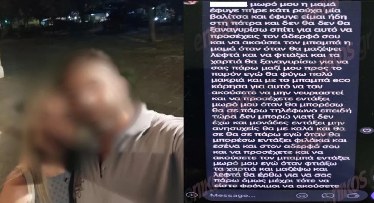 Χαρακτηριστικά, στο μήνυμα έγραφε πως, «προς το παρών εγώ θα φύγω πολύ μακριά και με τον μπαμπά εγώ χώρισα, για αυτό να τον ακούτε να μην νευριαστεί και να προσέχετε. Εντάξει μωρό μου; Όταν θα μπορέσω θα σε πάρω τηλέφωνο γιατί δεν μπορώ και δεν έχω μονάδες. Εντάξει μην ανησυχείς θα είμαι καλά και θα σε πάρω εγώ όταν θα μπορέσω. Εντάξει; Φυλάκια σε εσένα και στον αδελφό σου. Και να προσέχετε και να ακούτε τον μπαμπά. Εντάξει μωρό μου; Εγώ όταν φτιάξω τα χαρτιά και μαζέψω και λεφτά θα έρθω για να σας πάρω όμως μέχρι τότε να είστε φρόνιμοι να ακούτε τον μπαμπά και να προσέχετε ο ένας τον άλλον. Σας στέλνω η μαμά και σας αγαπώ πολύ όταν θα μπορέσω θα σε πάρω εγώ τηλέφωνο μωρό μου. Εντάξει αγάπη μου; Τώρα δεν μπορώ να μιλήσω άλλον».