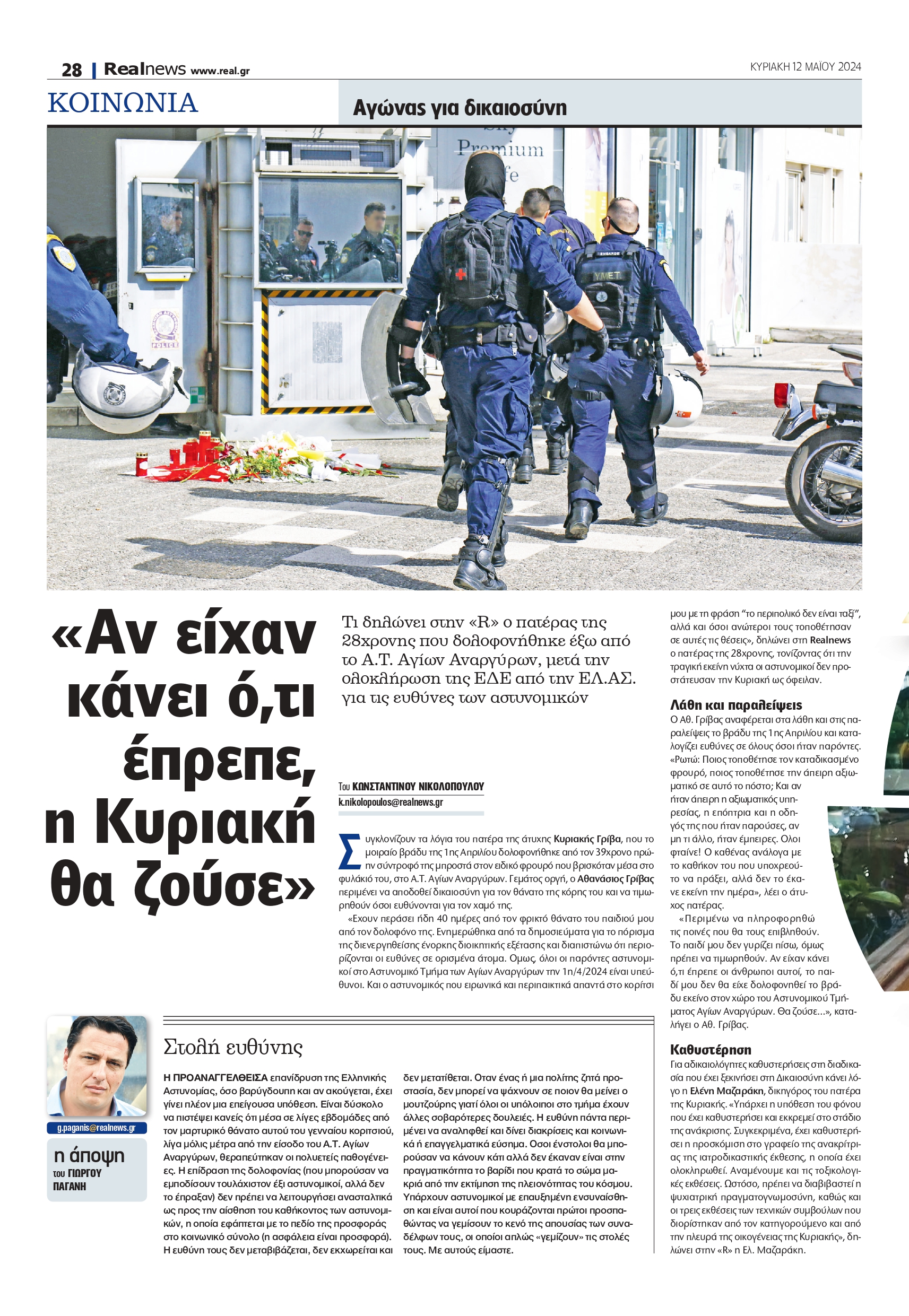 «Έχουν περάσει ήδη 40 ημέρες από τον φρικτό θάνατο του παιδιού μου από τον δολοφόνο της. Ενημερώθηκα από τα δημοσιεύματα για το πόρισμα της διενεργηθείσης ένορκης διοικητικής εξέτασης και διαπιστώνω ότι περιορίζονται οι ευθύνες σε ορισμένα άτομα. Όμως, όλοι οι παρόντες αστυνομικοί στο Αστυνομικό Τμήμα των Αγίων Αναργύρων την 1η/4/2024 είναι υπεύθυνοι. Και ο αστυνομικός που ειρωνικά και περιπαικτικά απαντά στο κορίτσι μου με τη φράση “το περιπολικό δεν είναι ταξί”, αλλά και όσοι ανώτεροι τους τοποθέτησαν σε αυτές τις θέσεις», δηλώνει στη Realnews ο πατέρας της 28χρονης, τονίζοντας ότι την τραγική εκείνη νύχτα οι αστυνομικοί δεν προστάτευσαν την Κυριακή ως όφειλαν.