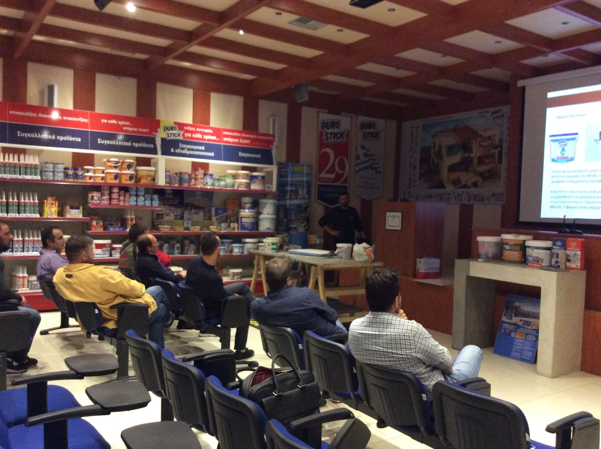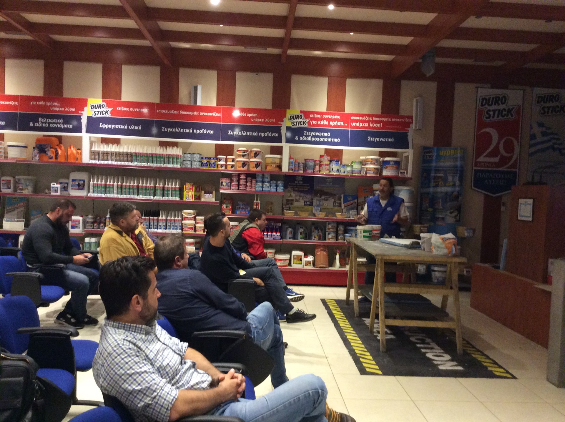 Η εταιρεία DUROSTICK ικανοποιώντας σχετικό αίτημα τεχνιτών της Βέροιας, σε συνέργεια με το κατάστημα Τσιαμήτρος, διοργάνωσε τη Δευτέρα 23 Οκτωβρίου 2017 στις εγκαταστάσεις της, στη Σίνδο Θεσσαλονίκης, ειδικό τεχνικό επιμορφωτικό σεμινάριο, θέλοντας να διαφωτίσει αλλά και να ενημερώσει για νέες λύσεις και συστήματα τον τεχνικό κόσμο της περιοχής.Το ανθρώπινο δυναμικό της DUROSTICK σε συνεργασία με το κατάστημα συνεργάτη της DUROSTICK Τσιαμήτρο Απόστολο ενημέρωσαν τον τεχνικό κόσμο για μια σειρά νέων προϊόντων αλλά και έδωσαν και λύσεις σε καθημερινά θέματα που συναντούν στη δουλειά τους. Αυτός εξάλλου ήταν και ο στόχος του σεμιναρίου, δηλαδή να καταρτίσουν και δώσουν χρήσιμες πληροφορίες στους τεχνίτες που επισκέφθηκαν το εκπαιδευτικό κέντρο της DUROSTICK στη Σίνδο.Ένα από τα βασικά αιτήματα των τεχνιτών ήταν η πληρέστερη ενημέρωση για την γκάμα των Πατητών Τσιμεντοκονιών της DUROSTICK αλλά και της Πατητής σε Πάστα, DS-258 DECO MICRO FLEX που κέρδισε τις εντυπώσεις των παρευρισκομένων τόσο για το άρτιο αισθητικά της αποτέλεσμα, όσο και την ευκολία της εφαρμογής του αλλά και της κάλυψης μιας πλειάδας αναγκών διακόσμησης που η Πατητή σε Πάστα της DUROSTICK μπορεί να καλύψει.