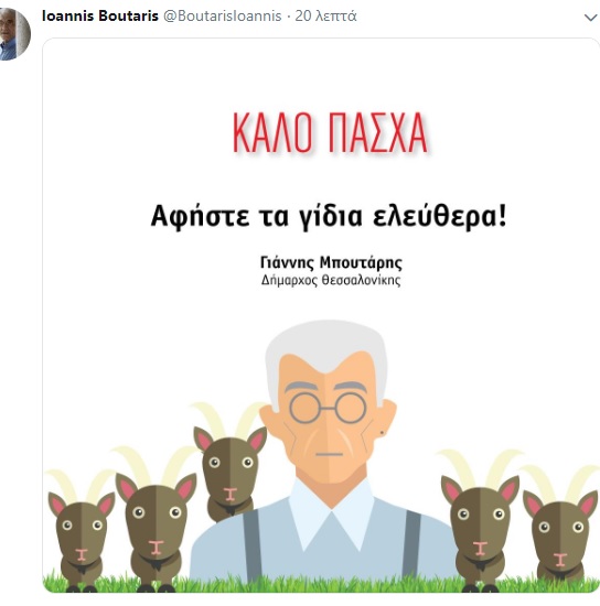 Με μια επική κάρτα την οποία δημοσίευσε στον προσωπικό του λογαριασμό στο twitter, έστειλε τις δικές του ευχές για το Πάσχα, ο δήμαρχος Θεσσαλονίκης, Γιάννης Μπουτάρης.