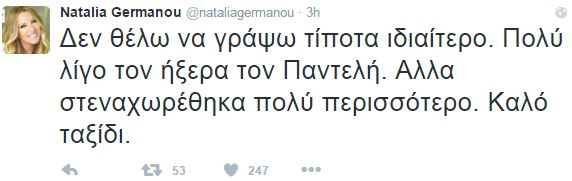 “Δεν θέλω να γράψω τίποτα ιδιαίτερο. Πολύ λίγο τον ήξερα τον Παντελή. Αλλα στεναχωρέθηκα πολύ περισσότερο. Καλό ταξίδι.” έγραψε η Ναταλία Γερμανού.