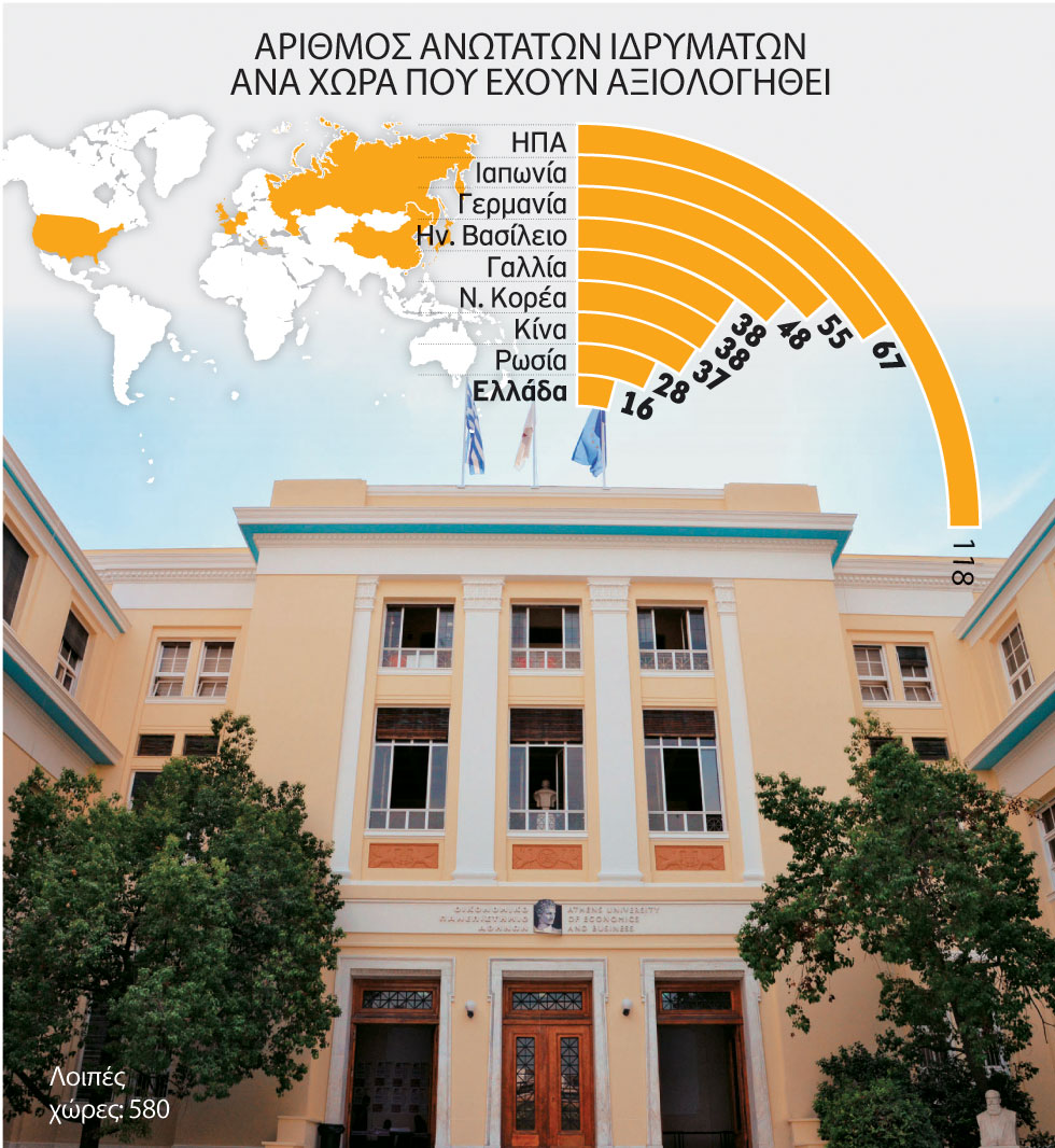 Το Καποδιστριακό Πανεπιστήμιο Αθηνών κατατάσσεται στην 175η θέση, ενώ ακολουθούν το ΑΠΘ (191), το Πάντειο (236), το Πανεπιστήμιο Πατρών (251), το Οικονομικό Αθηνών (257), το Χαροκόπειο (280), το Αιγαίου (300), το Δημοκρίτειο (310), το Ιωαννίνων (317), το Πανεπιστήμιο Κρήτης (369), το Πανεπιστήμιο Μακεδονίας (469), το Θεσσαλίας (509), το Πανεπιστήμιο Πειραιά (561), το Πανεπιστήμιο Πελοποννήσου (587), το Ιόνιο (596) και το Πανεπιστήμιο Δυτικής Μακεδονίας (660).
