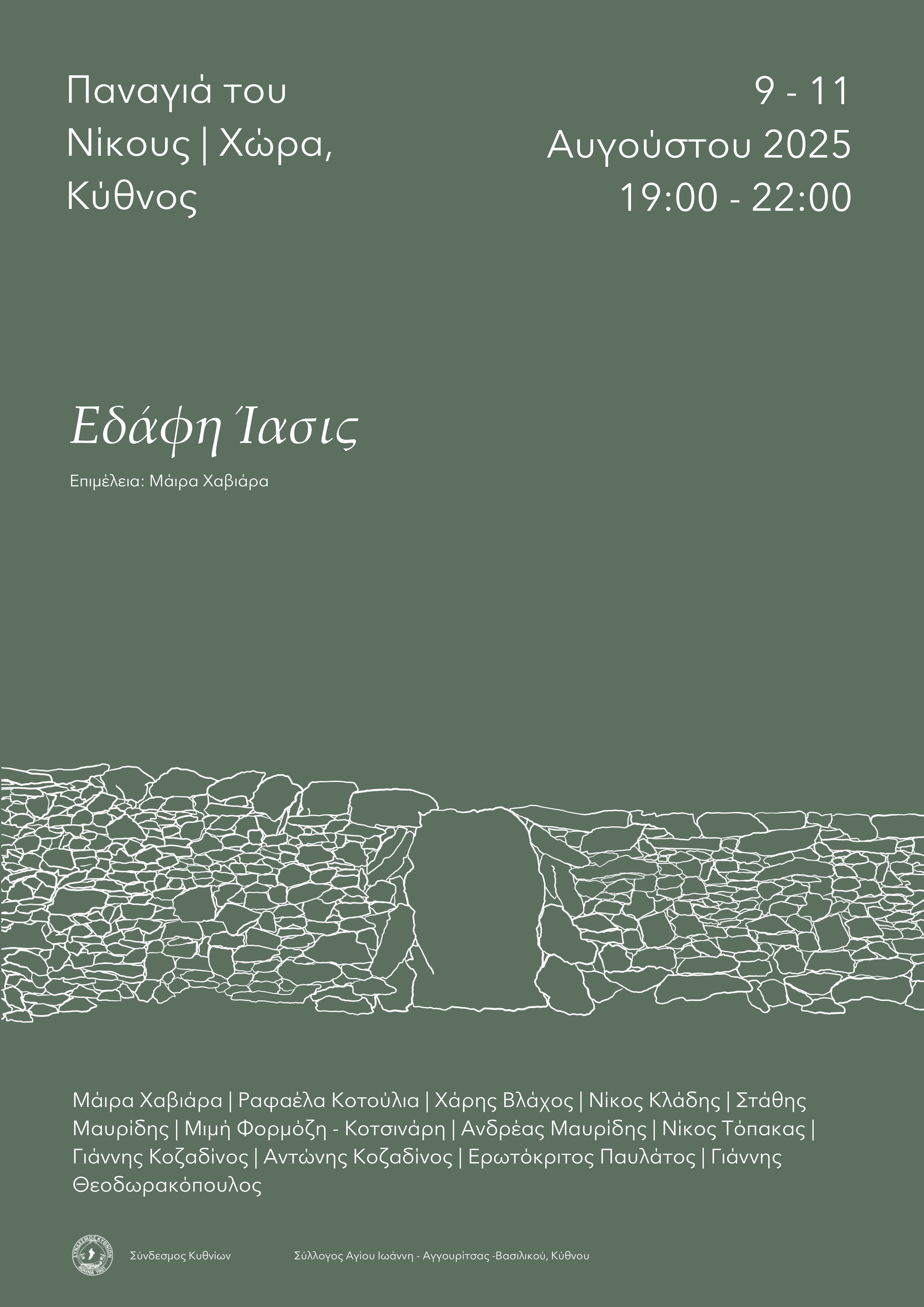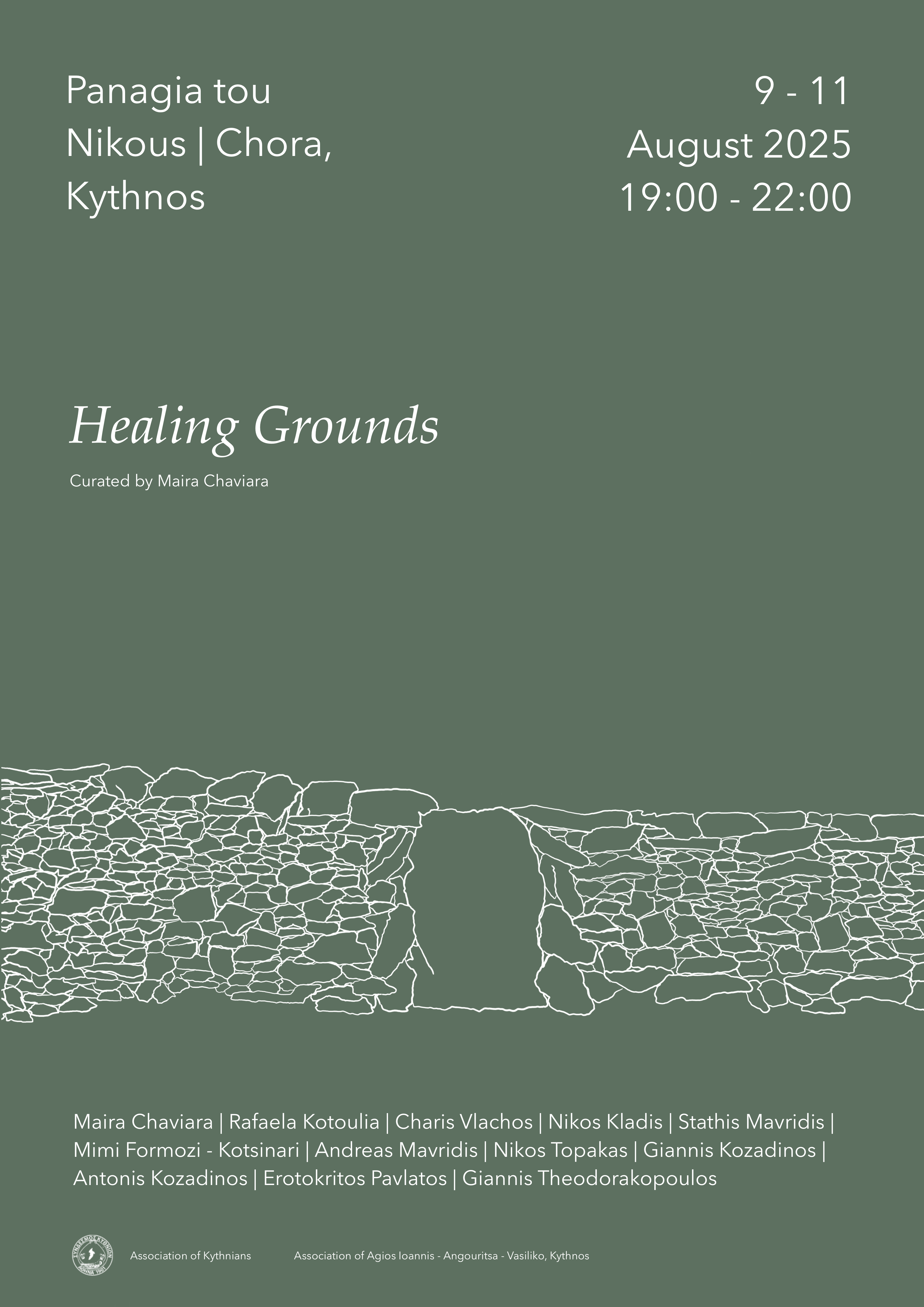 Η ομαδική έκθεση Healing Grounds – Εδάφη Ίασις πραγματοποιείται στον χώρο της Παναγιάς του Νίκους, ενός ιστορικού σημείου με ιδιαίτερη σημασία για το νησί της Κύθνου και τους ανθρώπους του. Η έκθεση συγκεντρώνει καλλιτέχνες και τεχνίτες με καταγωγή ή βαθιά σχέση με τον τόπο, σε μια συλλογική προσπάθεια αναστοχασμού πάνω στη σύνδεση με τον τόπο, τη μνήμη και την πράξη της φροντίδας.