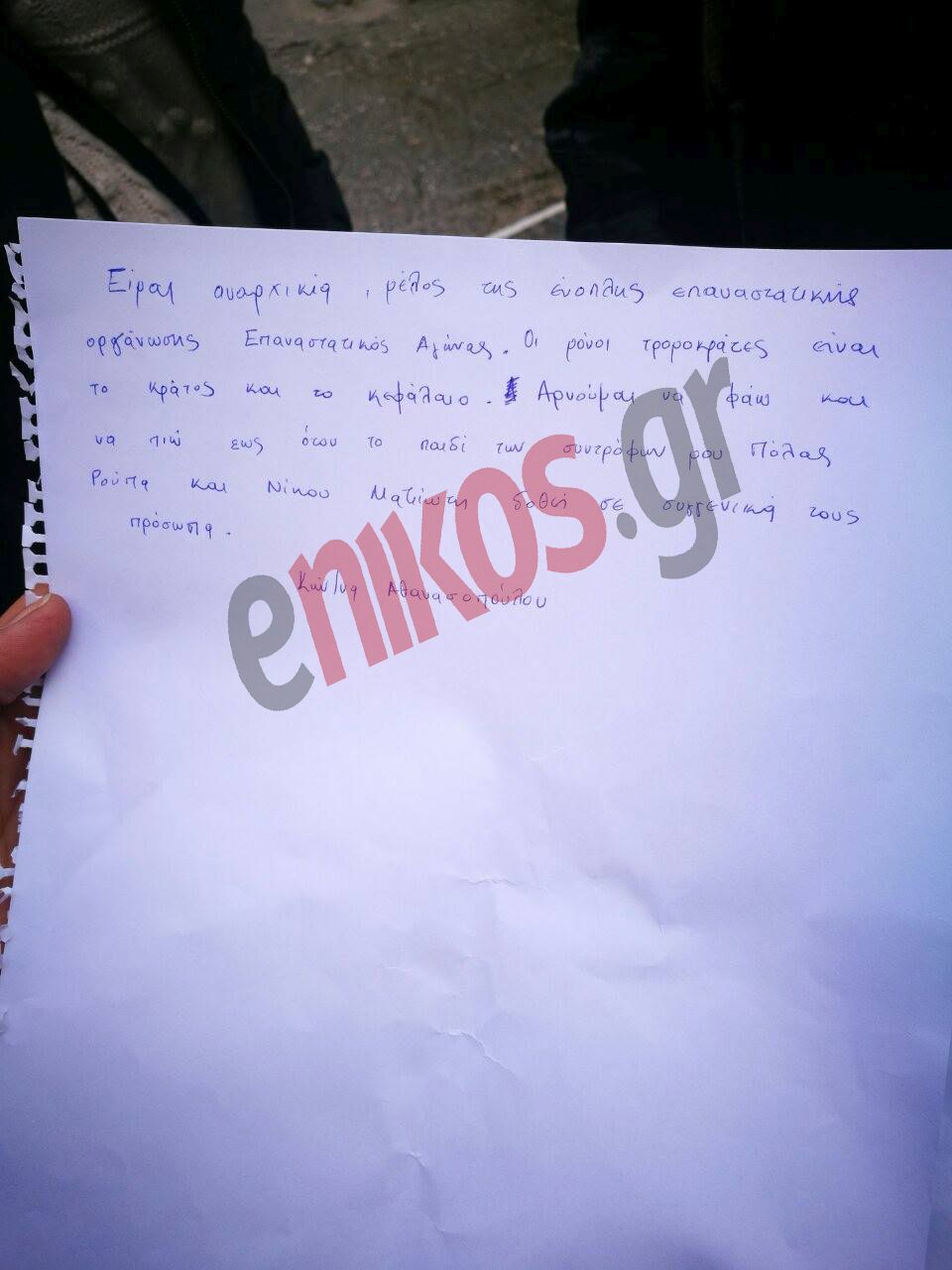Με χειρόγραφο σημείωμά της η 25χρονη που συνελήφθη μαζί με την Πόλα Ρούπα δηλώνει μέλος του Επαναστατικού Αγώνα και κάνει γνωστό ότι αρχίζει απεργία πείνας και δίψας μέχρι να δοθεί η επιμέλεια του παιδιού της Πόλας Ρούπα και του Νίκου Μαζιώτη σε συγγενικά τους πρόσωπα.