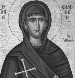 Στα ηθικά και αισθητικά πολυδύναμα για το κάλλος και το περιεχόμενό τους εγκώμια που έχουν γραφτεί για την Αγία Φιλοθέη, περιλαμβάνεται και το παρακάτω : «Δαυΐδ γαρ το πράον έσχες και Σολομώντος, σεμνή, την σοφίαν, Σαμψών την ανδρείαν, και Aβραάμ το φιλόξενον, υπομονήν τε Iώβ, του Προδρόμου δε θείαν άσκησιν…».