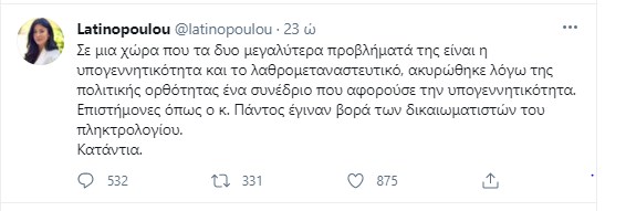 Την άποψη της για το συνέδριο γονιμότητας το οποίο ακυρώθηκε μετά τη θύελλα αντιδράσεων που προκλήθηκαν λόγω του σποτ, εξέφρασε μέσω των social media η Αφροδίτη Λατινοπούλου. “Σε μια χώρα που τα δυο μεγαλύτερα προβλήματά της είναι η υπογεννητικότητα και το λαθρομεταναστευτικό, ακυρώθηκε λόγω της πολιτικής ορθότητας ένα συνέδριο που αφορούσε την υπογεννητικότητα. Επιστήμονες όπως ο κ. Πάντος έγιναν βορά των δικαιωματιστών του πληκτρολογίου. Κατάντια” έγραψε η κ. Λατινοπούλου.