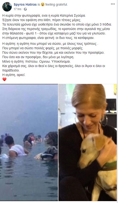 “Η κυρία στην φωτογραφία, είναι η κυρία Κατερίνα Σγούρα. Έζησε όλον τον εφιάλτη στο Μάτι, πέρσι τέτοιες μέρες. Τα τελευταία χρόνια είχε υιοθετήσει ένα σκυλάκι το οποίο είχε μόνο 3 πόδια. Στη διάρκεια της περσινής τραγωδίας, το κρατούσε στην αγκαλιά της μέσα στην θάλασσα – φωτό 1 – όπου είχε καταφύγει μαζί του για να γλυτώσει. Η επόμενη φωτιγραφια, είναι φετινή: οι δυο τους, τα κατάφεραν. Η αγάπη: η αγάπη που μπορεί να σώσει, με όλους τους τρόπους. Που μπορεί να σώσει πολλές φορές, με πολλές μορφές. Που σώνει εκείνον που την δέχεται, μα και εκείνον που την προσφέρει. Που όσο και αν προσφέρει, δεν μένει με λιγότερη. Μόνο η αγάπη: πιστεύω. Ομνυω. Υποκλίνομαι. Και χάρισμά σας, όλοι οι θεοί κ όλες οι θρησκείες, όλοι οι Άγιοι κ όλοι οι παράδεισοι. Η αγάπη, αρκεί”.