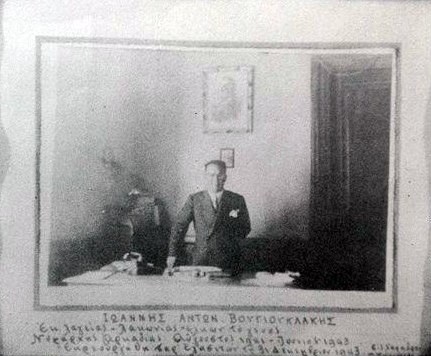 Φωτογραφία του Ιωάννη Βουγιουκλάκη, που είχε κρεμασμένη ο γιος του Τάκη στο σπίτι του και έγραφε: «Ιωάννης Αντωνίου Βουγιουκλάκης εκ Λαγείας Λακωνίας έλκων το γένος. Νομάρχης Αρκαδίας Αύγουστος 1941- Ιούνιος 1943. Εκρεουργήθη παρ’ ελασιτών τη 31 Δεκεμβρίου 1943 εις χαράδραν Κυνουρίας»….