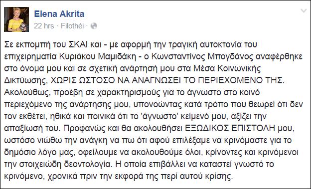 Η Έλενα Ακρίτα θέλησε μέσω του προσωπικού της λογαριασμού στο Facebook να γνωστοποιήσει το εξώδικο που πρόκειται να καταθέσει στον δημοσιογράφο και παρουσιαστή του ΣΚΑΙ, Κωνσταντίνο Μπογδάνο.
