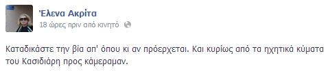 Την δικαιολογία του Ηλία Κασιδιάρη “Μπορεί να τον έριξα με τη δύναμη του μυαλού μου” για το χτύπημα στον φωτορεπόρτερ έξω από τα δικαστήρια της Ευελπίδων, σχολίασε στην προσωπική της σελίδα στο facebook, η Έλενα Ακρίτα.
