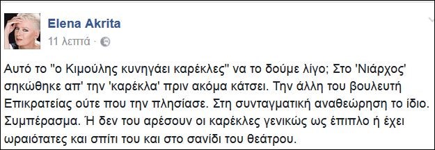 Με ανάρτησή της στον προσωπικό της λογαριασμό στο Facebook, η Έλενα Ακρίτα σχολίασε την παραίτηση του Γιώργου Κιμούλη από την θέση του προέδρου του Κέντρου Πολιτισμού «Σταύρος Νιάρχος». Η γνωστή δημοσιογράφος υπογράμμισε ότι με την κίνηση του αυτή, ο δημοφιλής ηθοποιός διέψευσε πανηγυρικά όσους υποστηρίζουν πως «κυνηγάει καρέκλες».Αναλυτικά το σχόλιο της Έλενας Ακρίτα:«Αυτό το “ο Κιμούλης κυνηγάει καρέκλες” να το δούμε λίγο; Στο ‘Νιάρχος’ σηκώθηκε απ’ την ‘καρέκλα’ πριν ακόμα κάτσει. Την άλλη του βουλευτή Επικρατείας ούτε που την πλησίασε. Στη συνταγματική αναθεώρηση το ίδιο. Συμπέρασμα. Ή δεν του αρέσουν οι καρέκλες γενικώς ως έπιπλο ή έχει ωραιότατες και σπίτι του και στο σανίδι του θεάτρου».