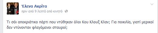 Η Έλενα Ακρίτα σχολίασε στο Facebook τις φωτογραφίες που είδαν το φως της δημοσιότητας και στις οποίες εικονίζονται μέλη της Χρυσής Αυγής να είναι ντυμένα με τη στολή της Κου Κλουξ Κλαν.