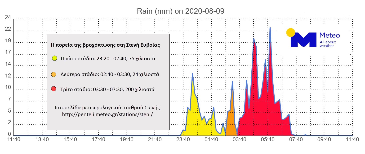 Σε τρία στάδια εκδηλώθηκαν οι ισχυρότατες βροχοπτώσεις στην Κεντρική Εύβοια, προκαλώντας τον θάνατο επτά ανθρώπων και σοβαρότατες καταστροφές, όπως προκύπτει από τις καταγραφές του σταθμού του δικτύου του Εθνικού Αστεροσκοπείου Αθηνών / meteo.gr στη Στενή Ευβοίας.