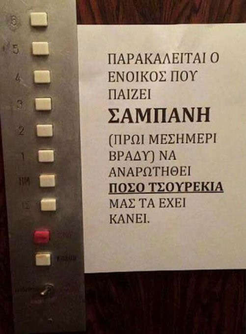 “Παρακαλείται ο ένοικος που παίζει Σαμπάνη (πρωί, μεσημέρι, βράδυ) να αναρωτηθεί πόσο τσουρέκια μας τα έχει κάνει” αναφέρει στην ανακοίνωση του ο διαχειριστής, η οποία έχει γίνει viral στα μέσα κοινωνικής δικτύωσης.