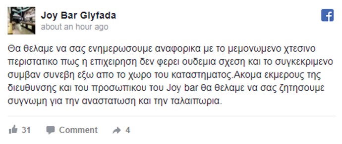 Η επιχείρηση σε ανάρτηση που έκανε στη σελίδα της στο Facebook σημειώνει ότι πρόκειται για μεμονωμένο περιστατικό που δεν σχετίζεται μαζί της.”Θα θέλαμε να σας ενημερώσουμε αναφορικά με το μεμονωμένο χτεσινό περιστατικό πως η επιχείρηση δεν φέρει ουδεμιά σχέση και το συγκεκριμένο συμβάν συνέβη έξω από το χώρο του καταστήματος. Ακόμα εκ μέρους της διεύθυνσης και του προσωπικοί του Joy bar θα θέλαμε να σας ζητήσουμε συγγνώμη για την αναστάτωση και την ταλαιπωρία” αναφέρει.