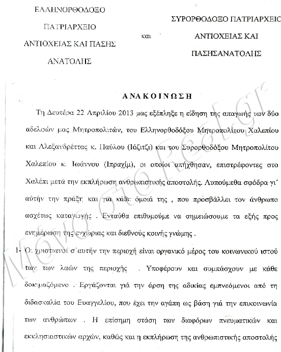 Η ανακοίνωση του Πατριαρχείου Αντιοχείας