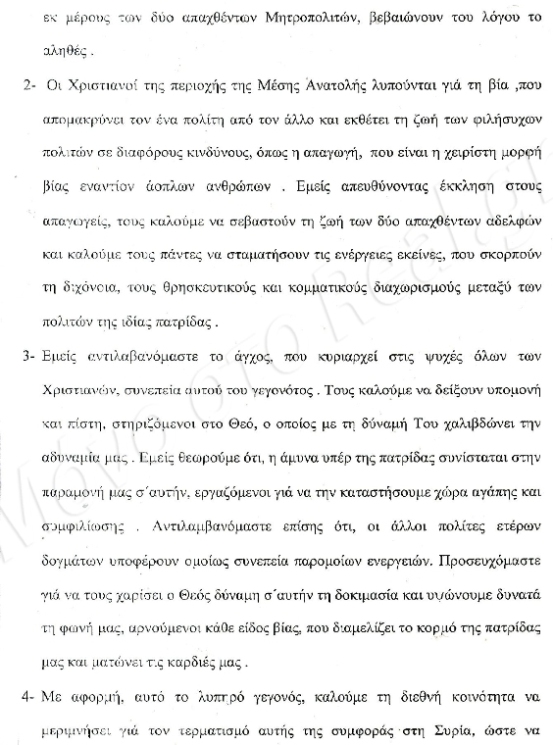 Σε επίσημη ανακοίνωση που συνυπογράφει με τον Συροθρόδοξο Πατριάρχη Ιγνάτιο Α΄ οι δυο προκαθήμενοι εκφράζουν την έκπληξη και τη λύπη τους για το γεγονός της απαγωγής και δηλώνουν ότι οι χριστιανοί σ’αυτή την περιοχή που είναι οργανικό μέρος του κοινωνικού ιστού των λαών της περιοχής υποφέρουν και συμπάσχουν με κάθε δοκιμαζόμενο και λυπούνται για τη βία, που απομακρύνει τον ένα πολίτη από τον άλλο και εκθέτει τη ζωή των φιλήσυχων πολιτών σε διάφορους κινδύνους, όπως η απαγωγή, που είναι η χείριστη μορφή βίας εναντίον αόπλων ανθρώπων.