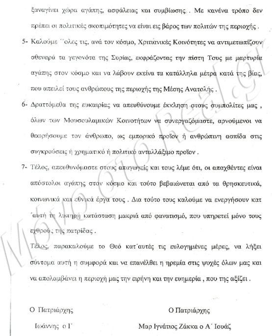 Καλούν ακόμα όλες τις, ανά τον κόσμο, Χριστιανικές κοινότητες να αντιμετωπίζουν σθεναρά τα γεγονότα στης Συρίας, εκφράζοντας την πίστη τους και να λάβουν εκείνα τα κατάλληλα μέτρα κατά της βίας, που απειλεί τους ανθρώπους της περιοχής της Μέσης Ανατολής.