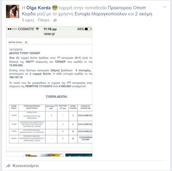 Η ιδιοκτήτρια του πρακτορείου όπου βρέθηκε το τυχερό δελτίο του Τζόκερ, κ. Όλγα Κόρδα, πόσταρε στο προφίλ της στο facebook την ανακοίνωση του ΟΠΑΠ για τον υπερτυχερό και όλοι οι φίλοι της νόμιζαν ότι εκείνη κέρδισε το Τζόκερ!