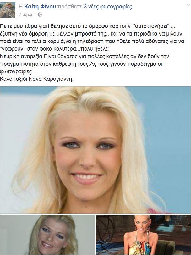 Η είδηση του θανάτου της Νανάς Καραγιάννη έχει προκαλέσει θλίψη σε ολόκληρη τη χώρα. Η γνωστή δημοσιογράφος βρέθηκε νεκρή το μεσημέρι της Τρίτης στο διαμέρισμά της, ενώ εδώ και χρόνια «πολεμούσε» με τη νευρική ανορεξία.Η ηθοποιός Καίτη Φίνου, αποχαιρέτησε τη δημοσιογράφο, με μία ανάρτηση στον προσωπικό της λογαριασμό στο facebook, κάνοντας λόγο παράλληλα και για τη νευρική ανορεξία.«Πείτε μου τώρα γιατί θέλησε αυτό το όμορφο κορίτσι ν’ “αυτοκτονήσει”…. έξυπνη νέα όμορφη με μέλλον μπροστά της… και να τα περιοδικά να μιλούν ποια είναι τα τέλεια κορμιά, να η τηλεόραση που ήθελε πολύ αδύνατες για να “γράφουν” στον φακό καλύτερα… πολύ ήθελε; Νευρική ανορεξία. Είναι θάνατος για πολλές κοπέλες αν δεν δουν την πραγματικότητα στον καθρέφτη τους. Ας τους γίνουν παράδειγμα οι φωτογραφίες. Καλό ταξίδι Νανά Καραγιάννη», έγραψε χαρακτηριστικά η ηθοποιός.