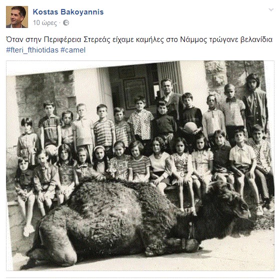 Με μία φωτογραφία σχολίασε ο Κώστας Μπακογιάννης τη συναυλία του Αντώνη Ρέμου στο Nammos της Μυκόνου, στο πλαίσιο της οποίας επιστρατεύτηκαν μέχρι και καμήλες από το Κουβέιτ.Ο περιφερειάρχης Στερεάς Ελλάδας ανέβασε στον προσωπικό λογαριασμό του στο Facebook μία φωτογραφία από το μακρινό παρελθόν. Στη φωτογραφία, από το χωριό Φτέρη Φθιώτιδας, μικρά παιδιά ποζάρουν πίσω από μια καμήλα. «Όταν στην Περιφέρεια Στερεάς είχαμε καμήλες στο Νάμμος τρώγανε βελανίδια #fteri_fthiotidas #camel», έγραψε ο κ. Μπακογιάννης.