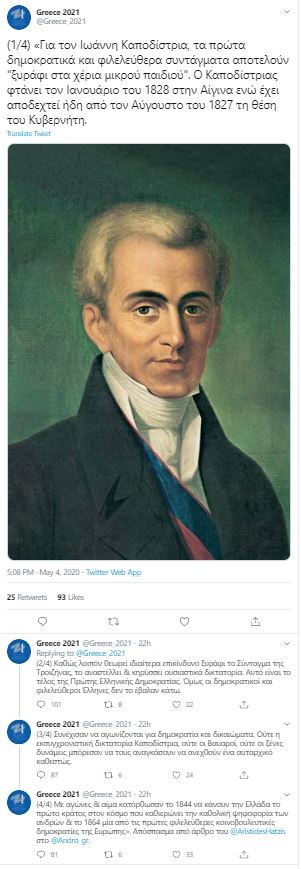 “Για τον Ιωάννη Καποδίστρια, τα πρώτα δημοκρατικά και φιλελεύθερα συντάγματα αποτελούν “ξυράφι στα χέρια μικρού παιδιού”. Ο Καποδίστριας φτάνει τον Ιανουάριο του 1828 στην Αίγινα ενώ έχει αποδεχτεί ήδη από τον Αύγουστο του 1827 τη θέση του Κυβερνήτη.Καθώς λοιπόν θεωρεί ιδιαίτερα επικίνδυνο ξυράφι το Σύνταγμα της Τροιζήνας, το αναστέλλει & κηρύσσει ουσιαστικά δικτατορία. Αυτό είναι το τέλος της Πρώτης Ελληνικής Δημοκρατίας. Όμως οι δημοκρατικοί και φιλελεύθεροι Έλληνες δεν το έβαλαν κάτω.Συνέχισαν να αγωνίζονται για δημοκρατία και δικαιώματα. Ούτε η εκσυγχρονιστική δικτατορία Καποδίστρια, ούτε οι Βαυαροί, ούτε οι ξένες δυνάμεις μπόρεσαν να τους αναγκάσουν να ανεχθούν ένα αυταρχικό καθεστώς. Με αγώνες & αίμα κατόρθωσαν το 1844 να κάνουν την Ελλάδα το πρώτο κράτος στον κόσμο που καθιερώνει την καθολική ψηφοφορία των ανδρών & το 1864 μία από τις πρώτες φιλελεύθερες κοινοβουλευτικές δημοκρατίες της Ευρώπης”, αναφέρεται χαρακτηριστικά στην ανάρτηση με αποτέλεσμα να προκληθούν αντιδράσεις στα κοινωνικά δίκτυα.