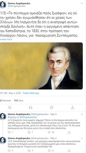 Στην πρώτη της ανάρτηση, η κα. Αγγελοπούλου μνημονεύει την “οργισμένη απάντηση του Καποδίστρια, το 1830, στην πρόταση του πλοιάρχου Λάιονς, για παραχώρηση Συντάγματος”, την οποία και παραθέτει: “Το σύνταγμα ομοιάζει πρός ξυράφιον, εις ού την χρήσιν δεν εγυμνάσθησαν έτι αι χείρες των Ελλήνων. Μη λησμονήτε δε ότι η ανατροφή αυτών υπήρξε δουλική”. Με αφορμή την απάντηση αυτή, η κα Αγγελοπούλου μας καλεί να σκεφτούμε “πού είμαστε σήμερα! Πλέον το Σύνταγμα αποτελεί την ασπίδα όλων μας. Μας διασφαλίζει ότι τα μέτρα για την αποκατάσταση της καθημερινότητας, μετά τον αποκλεισμό λόγω της Covid-19, θα είναι προσωρινά και θα έχουν μόνο την ένταση που απαιτείται” σημειώνει η κα Αγγελοπούλου.