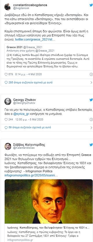 Πολλές αντιδράσεις προκάλεσε στα social media η ανάρτηση στον επίσημο λογαριασμό του “Ελλάδα 2021” με αναφορά του γνωστού καθηγητή Αριστείδη Χατζή που παρουσιάζει τον Ιωάννη Καποδίστρια σαν δικτάτορα.