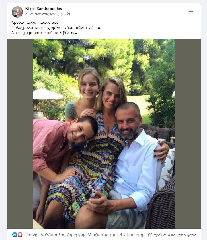Χρόνια πολλά στον γιο του, Γιώργο, ευχήθηκε ο Νίκος Ξανθόπουλος, ανεβάζοντας μια φωτογραφία στον λογαριασμό του στο Facebook. Συγκεκριμένα, ο ηθοποιός δημοσίευσε μία φωτογραφία, με τον γιο του και την οικογένειά του και στη λεζάντα της έγραψε: «Χρόνια πολλά Γιώργο μου..Πολύχρονος κι ευτυχισμένος να’ σαι πάντα γιέ μου. Να σε χαιρόμαστε που είσαι λεβέντης…».
