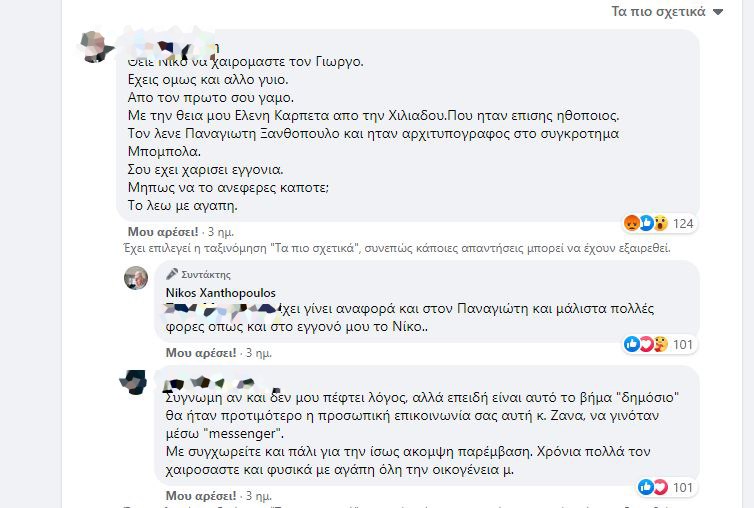 Μεταξύ των σχολίων κάτω από την ανάρτηση, υπήρχε και ένα από μια ανιψιά του. Μάλιστα, τα όσα έγραψε δημοσίως προκάλεσαν αντιδράσεις από κάποιους διαδικτυακούς φίλους του Νίκου Ξανθόπουλου. «Θείε Νίκο να χαιρόμαστε τον Γιώργο. Έχεις όμως και άλλο γιο. Από τον πρώτο σου γάμο. Με την θεία μου Ελένη Καρπέτα από την Χιλιαδού. Που ήταν επίσης ηθοποιός. Τον λένε Παναγιώτη Ξανθόπουλο και ήταν αρχιτυπογράφος στο συγκρότημα Μπόμπολα. Σου έχει χαρίσει εγγόνια. Μήπως να το ανέφερες κάποτε; Το λέω με αγάπη», ανέφερε η ανιψιά στο σχόλιό της.