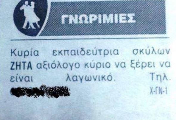 Το γύρο του διαδικτύου κάνει η αγγελία τοπικής εφημερίδας των Τρικάλων για το ξεχωριστό περιεχόμενο της, καθώς μία γυναίκα αναζητά «λαγωνικό» για σχέση.
