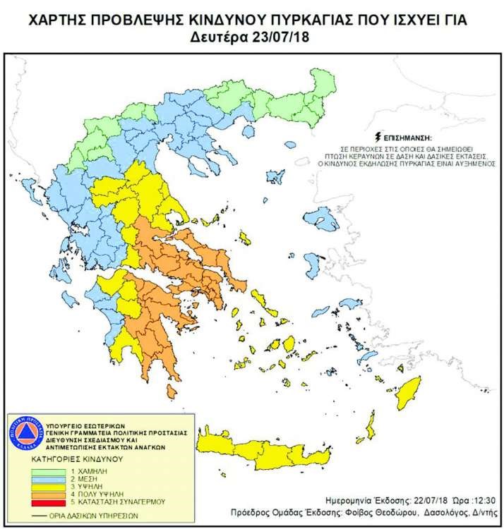 Ο χάρτης που δίνει στη δημοσιότητα η Γενική Γραμματεία Πολιτικής Προστασίας είχε σε «πορτοκαλί» συναγερμό (βαθμός επικινδυνότητας 4) με υψηλή πιθανότητα εκδήλωσης φωτιάς το σύνολο των Αττικής τη Δευτέρα 23 Ιουλίου, την ημέρα που ξέσπασε η φονική πυρκαγιά στην Ανατολική Αττική.