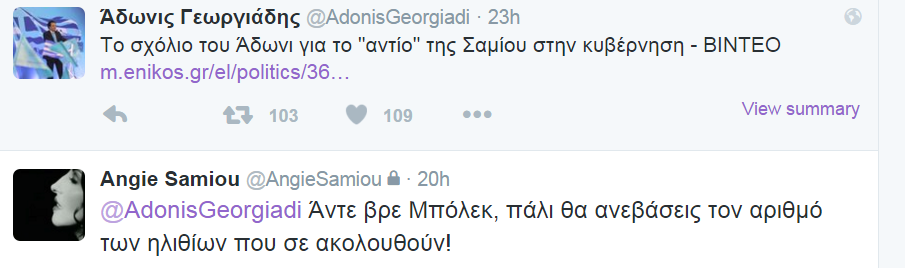 Η Άντζυ Σαμίου απάντησε “δυναμικά” στο σχόλιο του Άδωνι Γεωργιάδη για την ανάρτησή της στο Facebook, με την οποία εξέφρασε την αγανάκτηση και την απογοήτευσή της απέναντι στην κυβέρνηση. Ο βουλευτής της ΝΔ έκανε retweet την σχετική ανάρτηση από το enikos.gr με την τραγουδίστρια να του απαντά στο Twitter: