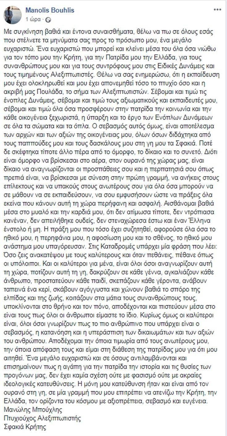 Δείτε την ανάρτηση του αλεξιπτωτιστή:«Με συγκίνηση βαθιά και έντονα συναισθήματα, θέλω να πω σε όλους εσάς που στέλνετε τα μηνύματα σας προς το πρόσωπο μου, ένα μεγάλο ευχαριστώ. Ένα ευχαριστώ που μπορεί και κλείνει μέσα του όλα όσα νιώθω για τον τόπο μου την Κρήτη, για την Πατρίδα μου την Ελλάδα, για τους συνανθρώπους μου και για τους συντρόφους μου στις Ειδικές Δυνάμεις και τους τιμημένους Αλεξιπτωτιστές. Θέλω να σας ενημερώσω, ότι η εκπαίδευση μου έχει ολοκληρωθεί και μου έχει απονεμηθεί τόσο το πτυχίο όσο και η ακριβή μας Πουλάδα, το σήμα των Αλεξιπτωτιστών. Σέβομαι και τιμώ τις ένοπλες Δυνάμεις, σέβομαι και τιμώ τους αξιωματικούς και εκπαιδευτές μου, σέβομαι και τιμώ όλα όσα προσφέρουν στην πατρίδα την κοινωνία και την κάθε οικογένεια ξεχωριστά, η ύπαρξη και το έργο των Ενόπλων Δυνάμεων σε όλα τα σώματα και τα όπλα. Ο σεβασμός αυτός όμως, είναι αποτέλεσμα των αρχών και των αξιών της οικογένειας μου, όλων όσων διδάχτηκα από τους παππούδες μου και τους δασκάλους μου στη γη μου τα Σφακιά. Ποτέ δε σκέφτηκα τίποτε άλλο πέρα από το όμορφο, το δίκαιο και το συνετό. Διότι είναι όμορφο να βρίσκεσαι στο αέρα, στον ουρανό της χώρας μας, είναι δίκαιο να αναγνωρίζονται οι προσπάθειες σου και η περπατησιά σου όπως πρεπιά είναι, να βρίσκεσαι με σύνεση στην πρώτη γραμμή, να ανήκεις στους επίλεκτους και να υπακούς στους ανωτέρους σου για όλα όσα μπορούν να σε μάθουν να σε εκπαιδεύσουν, να σου εμφυσήσουν ώστε να πράξεις όλα εκείνα που κάνουν αυτή τη χώρα περήφανη και ασφαλή. Αισθάνομαι βαθιά μέσα στο μυαλό και την καρδιά μου, ότι δεν ατίμωσα τίποτε, δεν ντρόπιασα κανέναν, δεν απειλήθηκε ουδείς, δεν στεναχώρεσα έστω και έναν Έλληνα ένστολο ή μη. Η πράξη μου που τόσο έχει συζητηθεί, αφορούσε όλα όσα το ηθικό μου, η περηφάνια μου, η αφοσίωση μου και το σθένος, το ηθικό μου ανάστημα μου υπαγόρευσαν. Στις Καταδρομές υπάρχει μία φράση που λέει: Όσο ζεις ανακατέψου με τους καλύτερους και όταν πεθάνεις, πέθανε όπως οι υπόλοιποι. Και οι καλύτεροι για μένα, είναι όλοι όσοι αναγνωρίζουν αυτή τη χώρα, ποτίζουν αυτή τη γη, δακρύζουν σε κάθε γέννα, αγκαλιάζουν κάθε άνθρωπο, προστατεύουν κάθε παιδί, σκεπάζουν κάθε γέροντα, ανάβουν ταπεινά ένα κερί, σκάβουν αγόγγυστα και χώνουν βαθιά το σπόρο της ελπίδας και της ζωής, κοιτάζουν στα μάτια τους συνανθρώπους τους, υποκλίνονται στο θρήνο και τον πόνο, αποδέχονται και πιστεύουν μέσα στο είναι τους πως όλοι οι άνθρωποι είμαστε το ίδιο. Κυρίως όμως οι καλύτεροι είναι, όλοι όσοι γνωρίζουν πως το πιο ανθρώπινο που υπάρχει είναι ο σεβασμός, η κατανόηση και η υπεράσπιση των δικαιωμάτων και των αξιών του ανθρώπου. Αποδέχομαι την όποια τιμωρία από τους ανωτέρους μου, την όποια απόφαση τους και είμαι στη διάθεση της πατρίδας μου για ότι μου αιτηθεί. Ένα μεγάλο ευχαριστώ και σε όσους αντιλαμβάνονται και επισημαίνουν πως η αγάπη για την πατρίδα την ιστορία και τις θυσίες των προγόνων μας, δεν έχει καμία σχέση ούτε με φασισμό ούτε με ακραίες ιδεολογικές κατευθύνσεις. Η μόνη μου κατεύθυνση ήταν και είναι από τον ουρανό στη γη, σε μία γραμμή που μου επιτρέπει να ατενίζω την Κρήτη, την Ελλάδα, τον ορίζοντα του κόσμου με αξιοπρέπεια, σεβασμό και ευγένεια.Μανώλης ΜπούχληςΠτυχιούχος ΑλεξιπτωτιστήςΣφακιά Κρήτης».Δείτε την ανάρτηση: