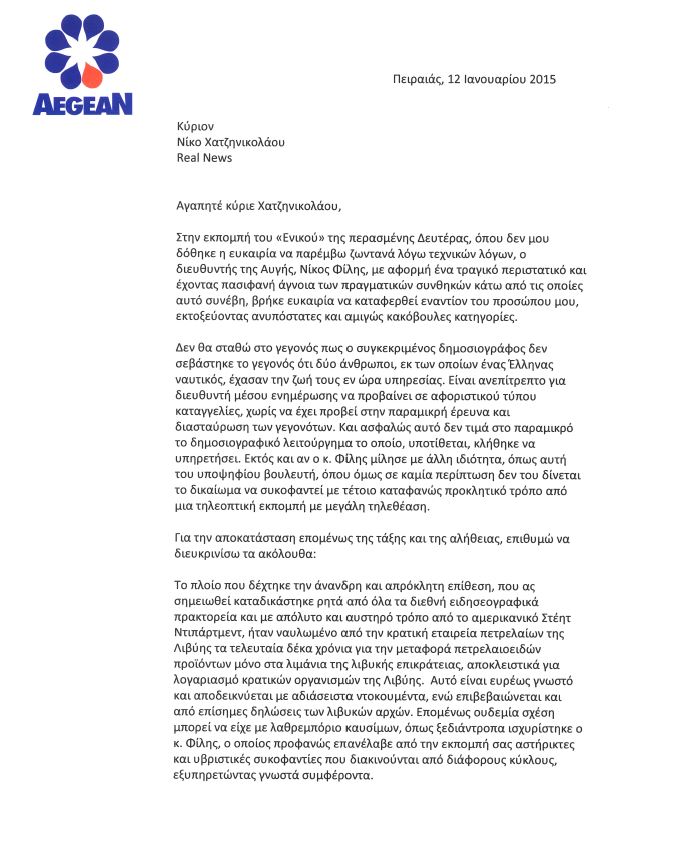 Το πλοίο που δέχτηκε την άνανδρη και απρόκλητη επίθεση, που ας σημειωθεί καταδικάστηκε ρητά από όλα τα διεθνή ειδησεογραφικά πρακτορεία και με απόλυτο και αυστηρό τρόπο από το αμερικανικό Στέητ Ντιπάρτμεντ, ήταν ναυλωμένο από την κρατική εταιρεία πετρελαίων της Λιβύης τα τελευταία δέκα χρόνια για την μεταφορά πετρελαιοειδών προϊόντων μόνο στα λιμάνια της λιβυκής επικράτειας, αποκλειστικά για λογαριασμό κρατικών οργανισμών της Λιβύης. Αυτό είναι ευρέως γνωστό και αποδεικνύεται με αδιάσειστα ντοκουμέντα, ενώ επιβεβαιώνεται και από επίσημες δηλώσεις των λιβυκών αρχών. Επομένως ουδεμία σχέση μπορεί να είχε με λαθρεμπόριο καυσίμων, όπως ξεδιάντροπα ισχυρίστηκε ο κ. Φίλης, ο οποίος προφανώς επανέλαβε από την εκπομπή σας αστήρικτες και υβριστικές συκοφαντίες που διακινούνται από διάφορους κύκλους, εξυπηρετώντας γνωστά συμφέροντα.
