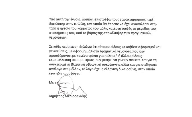 Ο Δημήτρης Μελισσανίδης απαντά με επιστολή του στον διευθυντή της εφημερίδας “Αυγή” Νίκο Φίλη, ο οποίος αναφέρθηκε στο όνομά του στην εκπομπή “Στον ενικό” με τον Νίκο Χατζηνικολάου.