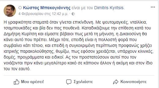 “Η γραφικότητα σταματά όταν γίνεται επικίνδυνη. Με ψευτομαγκιές, νταϊλίκια, τσαμπουκάδες και βία δεν πας πουθενά. Καταδικάζουμε την επίθεση κατά του Δημήτρη Κυρίτση και είμαστε βέβαιοι πως μετά τη μήνυση, η Δικαιοσύνη θα κάνει αυτό που πρέπει. Μέχρι τότε, επειδή είναι η πολλοστή φορά που συμβαίνει κάτι τέτοιο, και επειδή η συγκεκριμένη περίπτωση προφανώς χρήζει ιατρικής παρακολούθησης, θυμίζω, πως εφόσον χρειάζεται, υπάρχουν κλινικές, δομές, προγράμματα και ειδικοί. Ας τον προστατεύσουν αυτοί που τον νοιάζονται πριν κάνει μεγαλύτερο κακό σε κάποιον άλλον ή ακόμη και στον ίδιο του τον εαυτό”, είχε αναφέρει συγκεκριμένα ο Κώστας Μπακογιάννης.