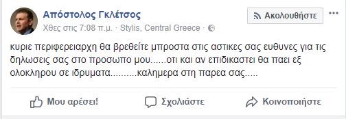 «Κύριε περιφερειάρχη θα βρεθείτε μπροστά στις αστικές σας ευθύνες για τις δηλώσεις σας στο πρόσωπό μου. Ό,τι και αν επιδικαστεί θα πάει εξ ολοκλήρου σε ιδρύματα», έγραψε ο Δήμαρχος Στυλίδας στον λογαριασμό του.