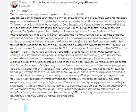 Διαβάστε αναλυτικά την ανάρτηση του σκηνοθέτη:”ΔΕΛΤΙΟ ΤΥΠΟΥΣχετικά σε όσα αναφέρονται για εμένα στο fb και στα ΜΜΕΣτις ταινίες μου αναφερόμουν πάντα στην σεξουαλικότητα. Στις ενορμήσεις ζωής και θανάτου στην σεξουαλικότητα. Κατήγγειλα την ενδοοικογενειακή βία καθώς και την βία κάθε μορφής. Υπάρχουν σκηνές με γυμνό, αυνανισμό, στύση, βιασμό, σεξ. Όμως πάντα ως καταγγελία ή ως κυνισμό απέναντι στην υποκρισία της κοινωνίας και όχι ως αυτοσκοπό. Αυτονόητα ένας ηθοποιός θα βρεθεί γυμνός. Αν το θελήσει. Αυτά τα πράγματα δεν επιβάλλονται. Δεν απαγορεύεται να ζητήσεις γυμνό όταν ορίζεται από το καλλιτεχνικό έργο. Και στις οντισιόν. Δεν απαγορεύεται η ελευθερία της έκφρασης. Είναι κατοχυρωμένη στο σύνταγμα. Μπορείς να ζητήσεις κάτι από κάποιον. Μπορεί ο άλλος να το αρνηθεί. Δεν επιβάλλεται στον καλλιτέχνη πως θα πραγματοποιήσει το έργο του. Συμφωνείς ή διαφωνείς. Φανταστείτε τον Παζολίνι να απολογείται γιατί ζήτησε γυμνό για το SALO. Ή τον Λαρς φον Τριερ για τους ΗΛΙΘΙΟΥΣ με την περιβόητη σκηνή ομαδικού σεξ. Ίσως προσπαθείτε να ορίσετε τι είναι ηθικά σωστό και τι λάθος. Όμως προσωπικά δεν μπορώ να προσφέρω κάποιο αντάλλαγμα, γιατί δεν κατέχω κάποια εξουσία για να την καταχραστώ. Δεν έχω αξίωμα. Δεν είμαι θεσμικός. Δεν είμαι διάσημος. Είμαι ένας εύκολος στόχος. Ουδέποτε έχω πιέσει κανέναν να λειτουργήσει με τρόπο που δεν επιθυμεί και κάθε ηθοποιός είναι σε θέση να αποφασίσει που θέλει να συμμετέχει και που όχι. Θλίβομαι για την προσβολή της προσωπικότητάς μου και την στοχοποίησή μου και υπενθυμίζω στους επικριτές μου ότι υπάρχουν και άλλοι σκηνοθέτες σε ολόκληρο τον κόσμο που ακολουθούν αντίστοιχο τρόπο κινηματογράφησης. Θλίβομαι όμως ακόμα περισσότερο που κανείς δεν σχολίασε τις τοποθετήσεις των ηθοποιών Μηλιάρη και Νιάρου, που στις αναρτήσεις τους εναντίον μου δηλώνουν: “Όλοι και όλες να δημιουργήσουμε έναν συλλογικό εκφοβισμό” “…Θα τον κάνει όπως και άλλους του σιναφιού του να φοβηθούν, να μαζευτούν, ή και να εξαφανιστούν από τον χώρο”, “Στις δραματικές σχολές μαζί με το απολυτήριο να υπάρξουν λίστες με ονόματα από τέτοιους τύπους”. Πίστευα ότι η εποχή των απαγορευμένων καλλιτεχνών και των μαύρων λιστών είχε παρέλθει.Κώστας Ζάπας”.