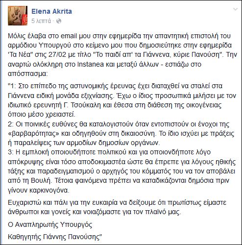 Ο αναπληρωτής υπουργός Δημόσιας Τάξης Γιάννης Πανούσης απάντησε στην επιστολή της Έλενας Ακρίτα με τίτλο «Το παιδί απ’ τα Γιάννενα, κύριε Πανούση» που αναφερόταν στον αγνοούμενο φοιτητή Βαγγέλη Γιακουμάκη. Η δημοσιογράφος ανήρτησε ένα απόσπασμα από την απαντητική επιστολή του κ. Πανούση στην σελίδα της στο Facebook.