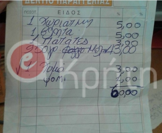 Ο ιδιοκτήτης της ταβέρνας χωρίς κανένα ενδοιασμό αντί να φέρει την απόδειξη για να πληρωθεί νόμιμα τα 60 ευρώ που κόστιζε το τραπέζι έφερε το δελτίο παραγγελίας.