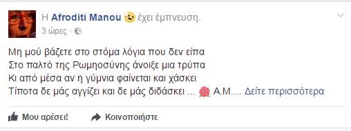 Με δύο αναρτήσεις στο προφίλ της στο Facebook η τραγουδίστρια, Αφροδίτη Μάνου “απολογήθηκε” για τους απρεπείς χαρακτηρισμούς προς τον Βόλφγκανγκ Σόιμπλε που είχαν ως συνέπεια η ιστοσελίδα κοινωνικής δικτύωσης να “κατεβάσει” το σχόλιο της.