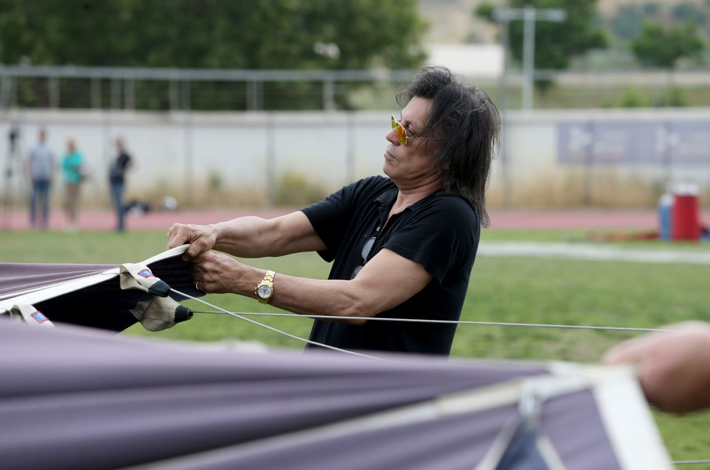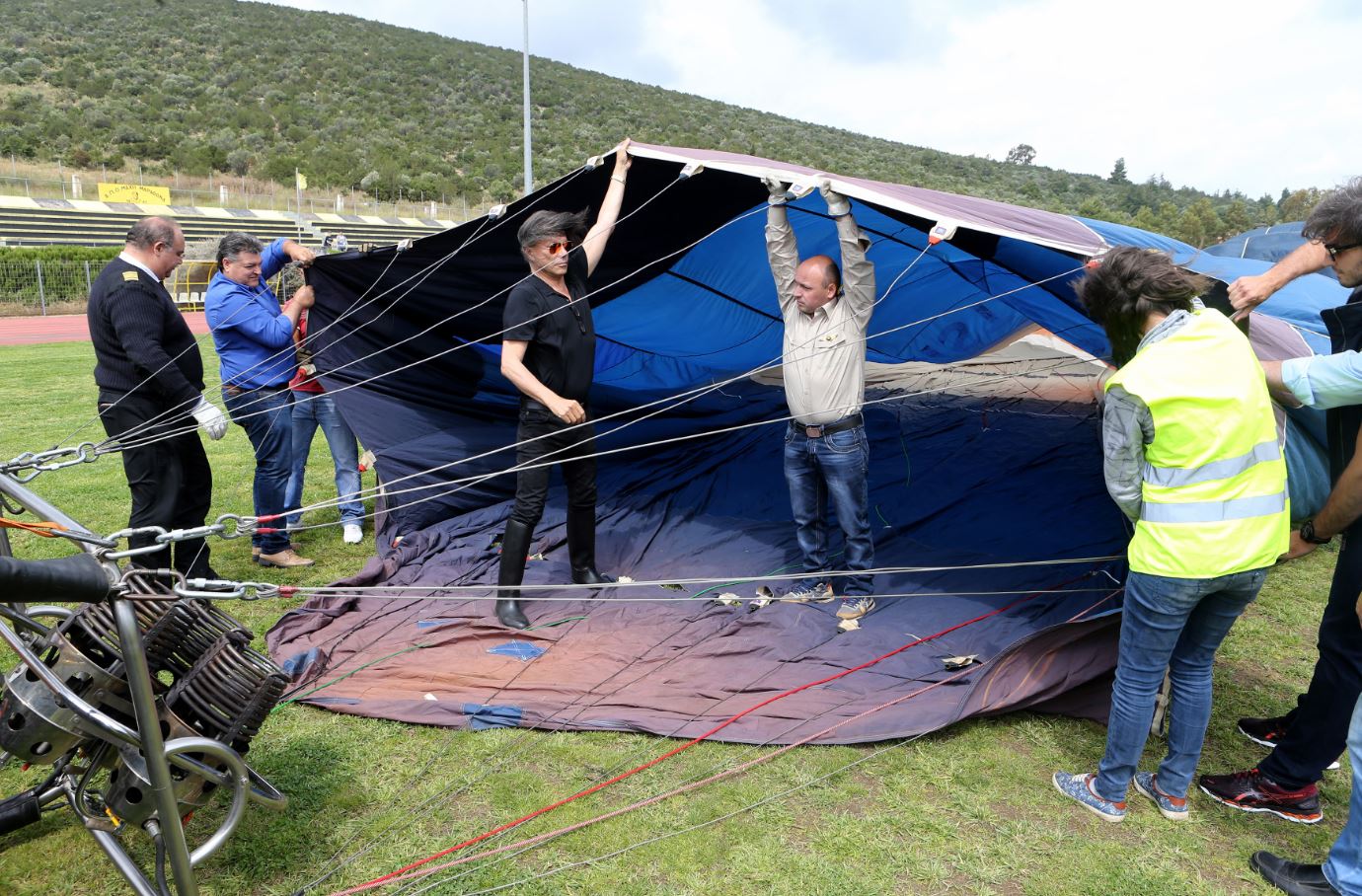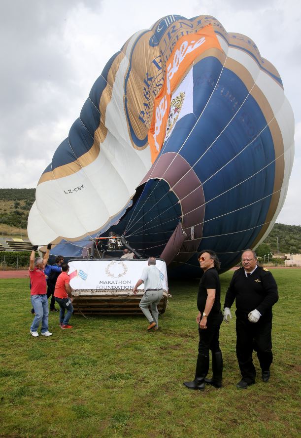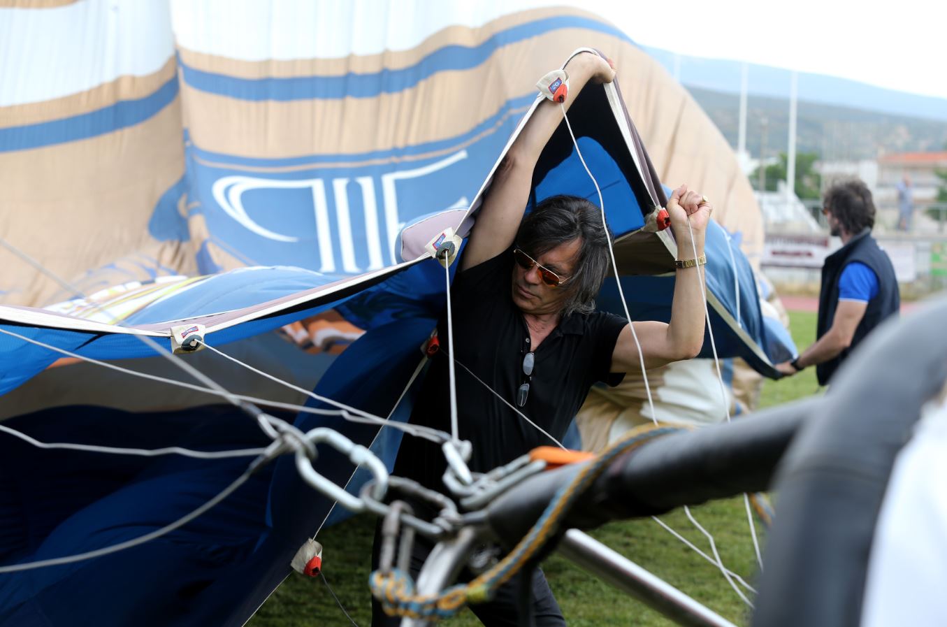 Όπως φαίνεται και στις φωτογραφίες, ο Ηλίας Ψινάκης, συμμετέχει στην προετοιμασία φουσκώματος του αερόστατου, ενώ οι δυνατοί άνεμοι που έπνεαν στην περιοχή, του δημιούργησαν δυσκολίες.