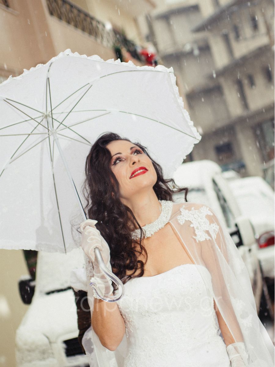 Μέσα σ’ αυτό το σπάνιο και παραμυθένιο σκηνικό, η Γεωργία, με ένα δαντελένιο νυφικό και κρατώντας ολόλευκη ομπρέλα, όχι μόνο δεν πτοήθηκε από τον χιονιά αλλά περήφανη και… ατρόμητη, ανέβηκε τα σκαλιά και κατευθύνθηκε στον Ναό, όπου την περίμενε ο αγαπημένος της, Ανδρέας.