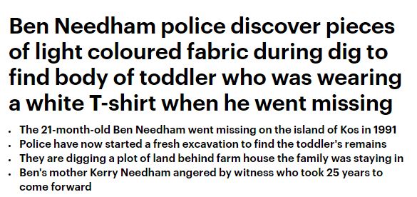 Όπως αναφέρει το δημοσίευμα, ο αστυνομικός Jon Cousins δήλωσε ότι τα ευρήματα παρουσιάζουν «ενδιαφέρον» και πρόσθεσε ότι «ο μικρός Μπεν την ημέρα που εξαφανίστηκε φορούσε ένα λευκό κοντομάνικο μπλουζάκι».