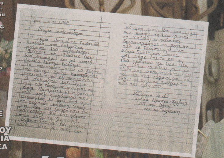 H έκθεση μαθήτριας του δημοτικού σχολείου στα Σήμαντρα Χαλκιδικής, στην οποία περιγράφεται με κάθε λεπτομέρεια η ευγενική χειρονομία της Παναγιώτας Σταμπουλή να δωρίσει ασθενοφόρο στο Γενικό Νοσοκομείο Χαλκιδικής. ΠΗΓΗ: espresso