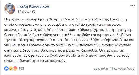Όμως όπως δηλώνει στο Flashnews.gr η κα Καλλίνικου, σε επικοινωνία που είχε με τη δασκάλα, της δήλωσε πως τελικά δεν θα επιστρέψει Γαύδο γιατί μάλλον θα παραιτηθεί.